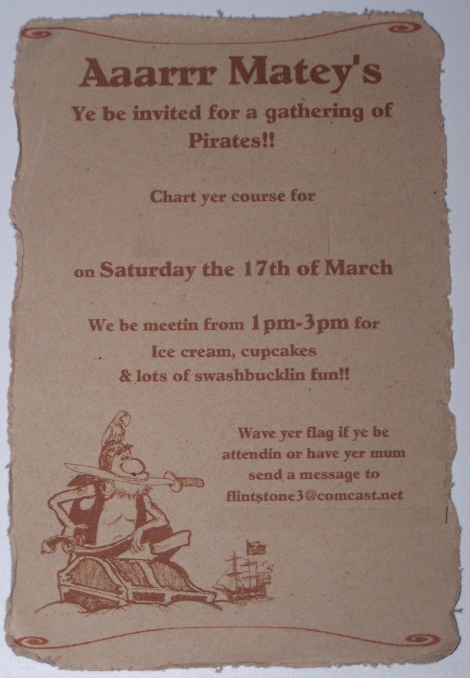 These are Gus' 5th birthday invites. He wants a pirate birthday if you couldn't tell. These were so fun to make and easier than I thought. I did a few test runs with white paper and soaking it in tea but that was an epic fail. Then I remembered I had some brown paper leftover form my wedding invites and just used Distress Ink and dang it if I didn't SOAR!!!!